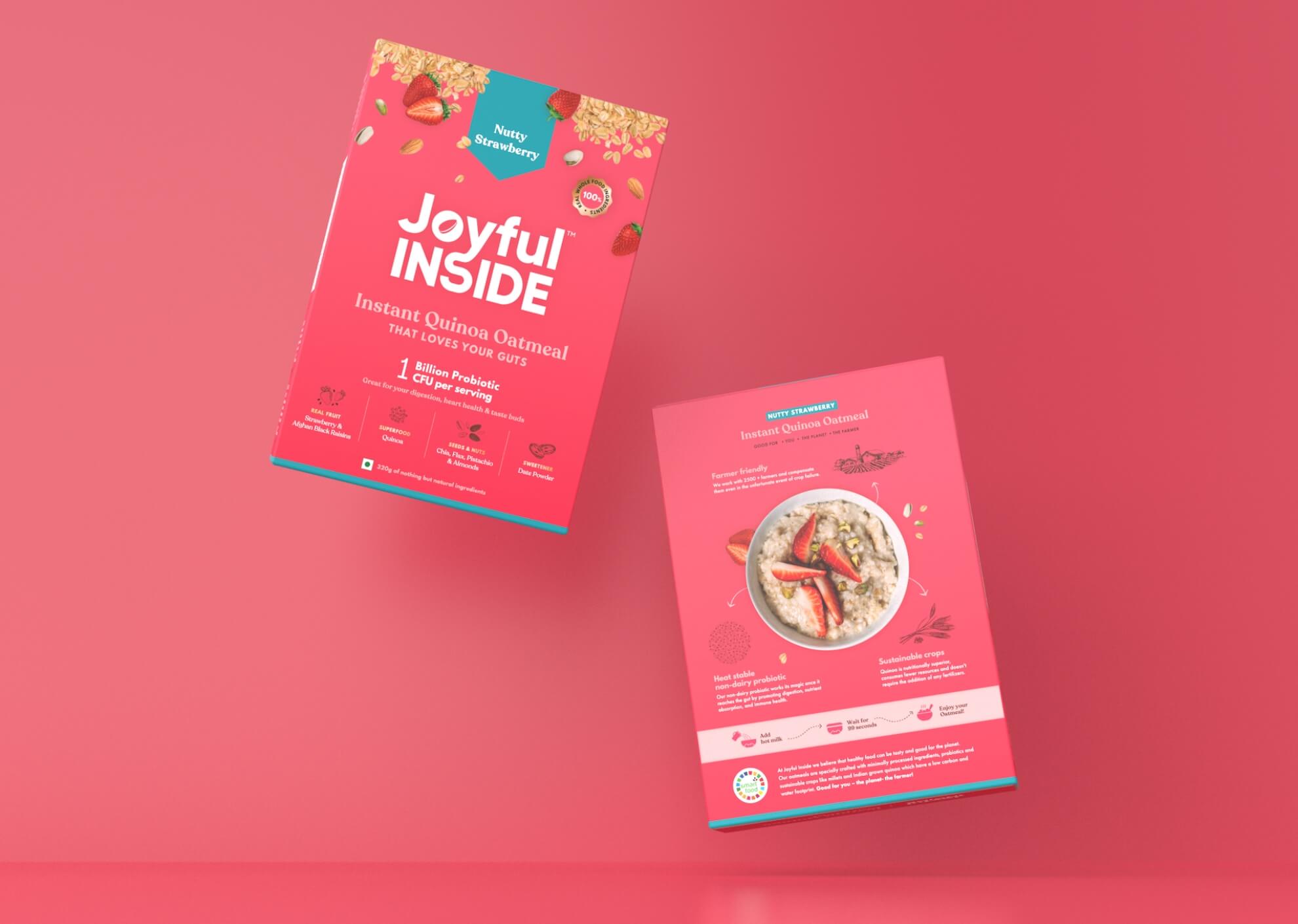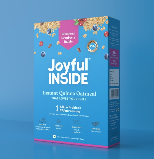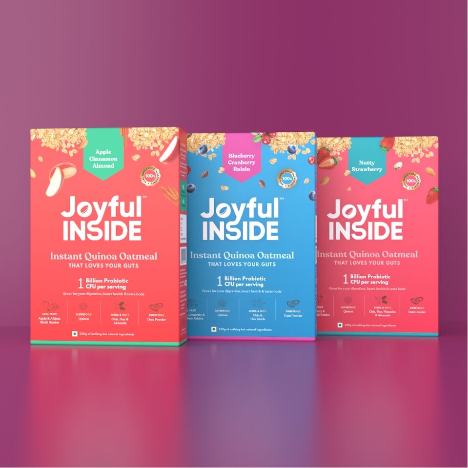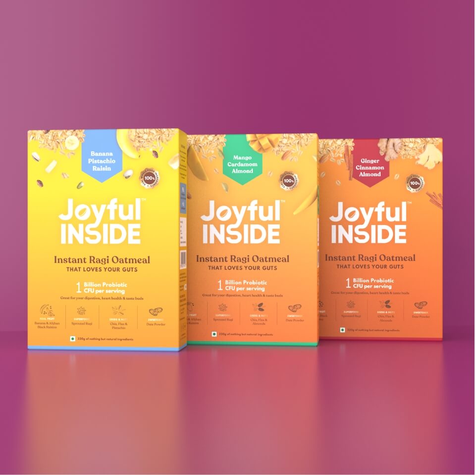 Joyful Inside is a probiotic food brand creating a new market in India. The project involved competitive research, brand strategy, brand identity and packaging design for their first line of products – India’s first probiotic oatmeal. The ask was to create a breakfast cereal brand like no other – youthful without being childish, trustworthy without any asterisks, something that no one had seen before. And that’s exactly what we did.
