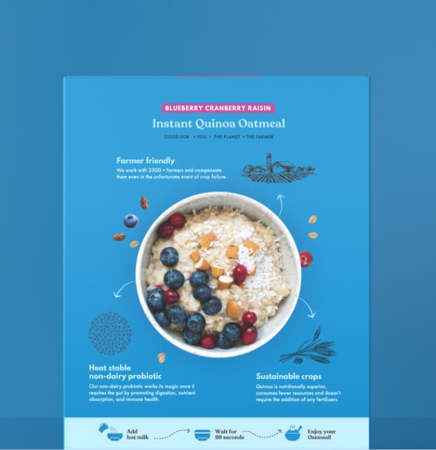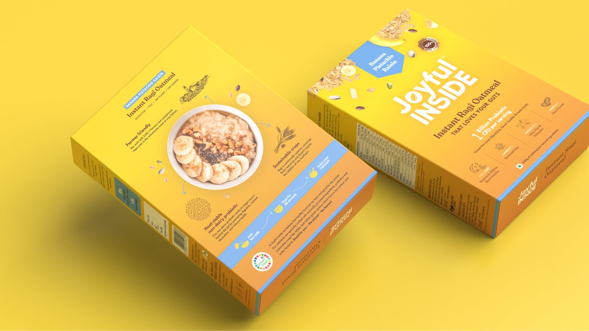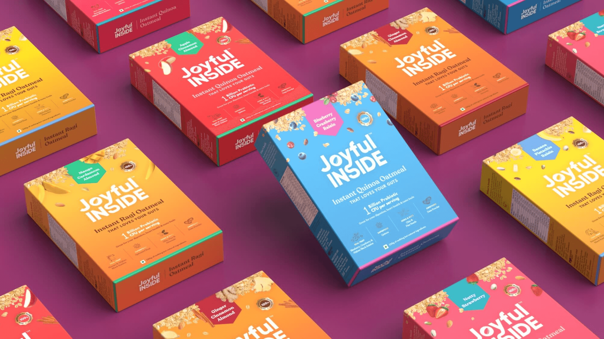 Joyful Inside is a probiotic food brand creating a new market in India. The project involved competitive research, brand strategy, brand identity and packaging design for their first line of products – India’s first probiotic oatmeal. The ask was to create a breakfast cereal brand like no other – youthful without being childish, trustworthy without any asterisks, something that no one had seen before. And that’s exactly what we did.