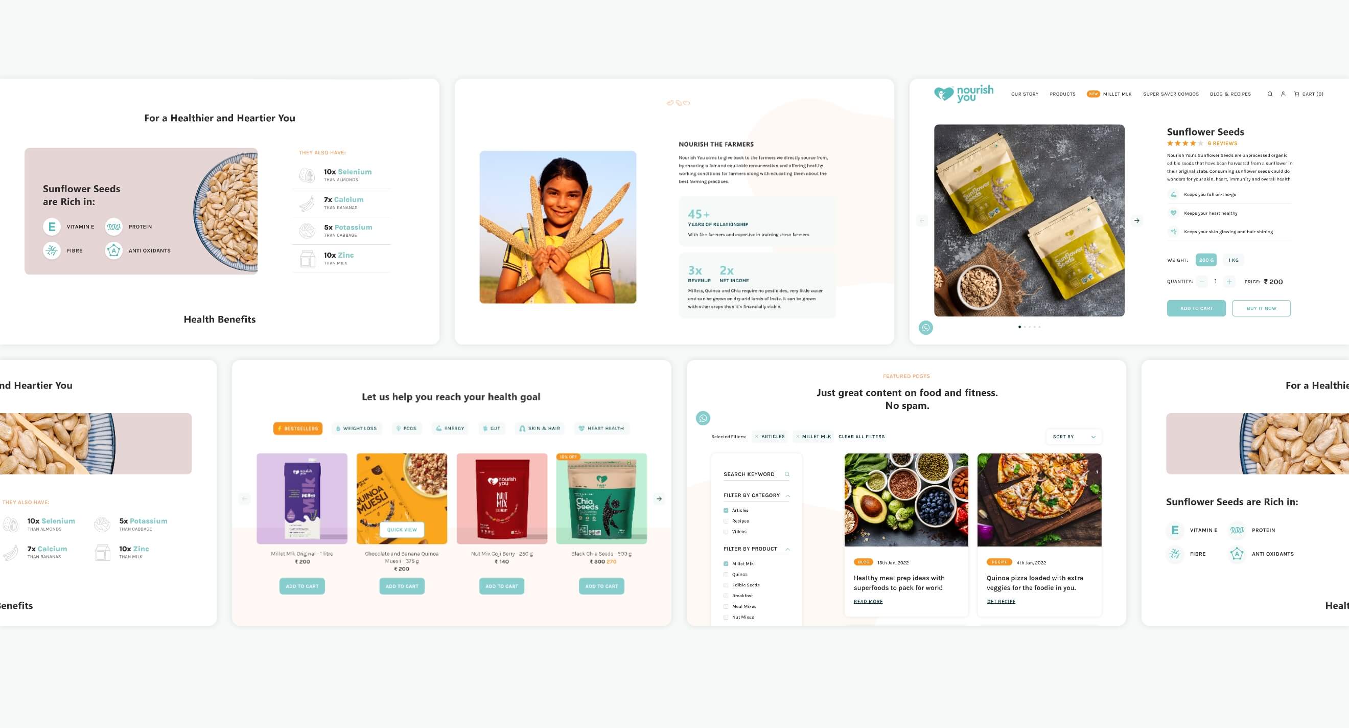 Breaking free from the templated confines of the previous design, we sought to introduce an airy and bright canvas to clearly understand the products and categories, the story behind Nourish You and the value that superfoods can provide. The site is transparent in its communication and bursting with credibility and personality.